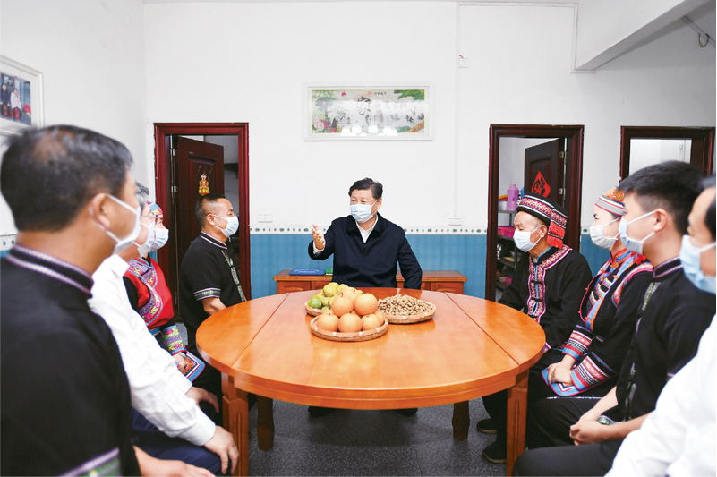 2020年9月16日至18日,中共中央总书记、国家主席、中央军委主席习近平在湖南考察。这是16日下午,在郴州市汝城县文明瑶族乡沙洲瑶族村,习近平同村民朱小红一家拉家常。 新华社记者 谢环驰/摄