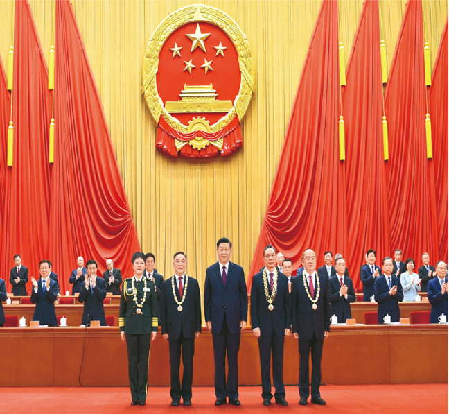 2020年9月8日,全国抗击新冠肺炎疫情表彰大会在北京人民大会堂隆重举行。中共中央总书记、国家主席、中央军委主席习近平向“共和国勋章”获得者钟南山(前排右二),“人民英雄”国家荣誉称号获得者张伯礼(前排左二)、张定宇(前排右一)、陈薇(前排左一)颁授勋章奖章。 新华社记者 谢环驰/摄