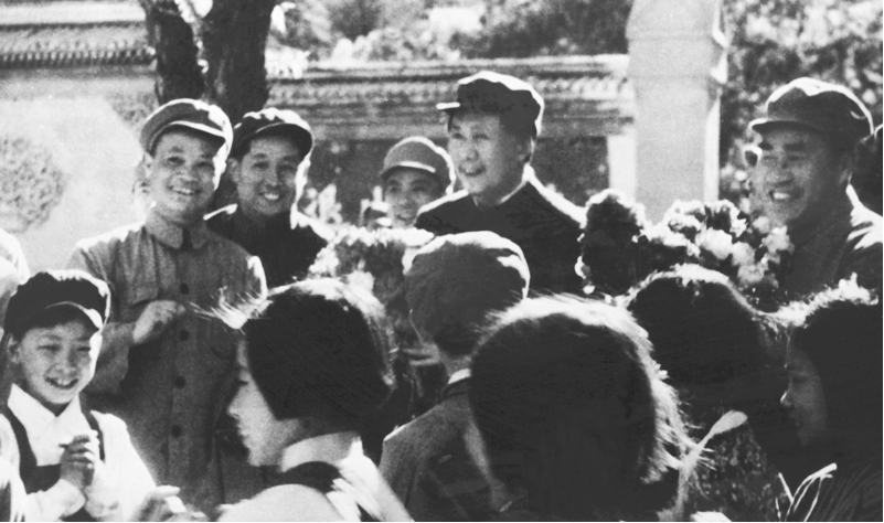 1949年4月,毛泽东、朱德在香山接见出席中国新民主主义青年团第一次全国代表大会的全体代表。图为毛泽东、朱德在接受少年儿童献花。 香山革命纪念馆供图