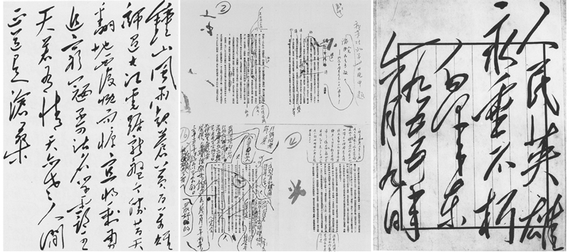 图为毛泽东文稿手迹:《七律·人民解放军占领南京》(左图)、《论人民民主专政》的部分清样修改稿(中图)、为人民英雄纪念碑专门题写的碑文(右图)。 香山革命纪念馆供图